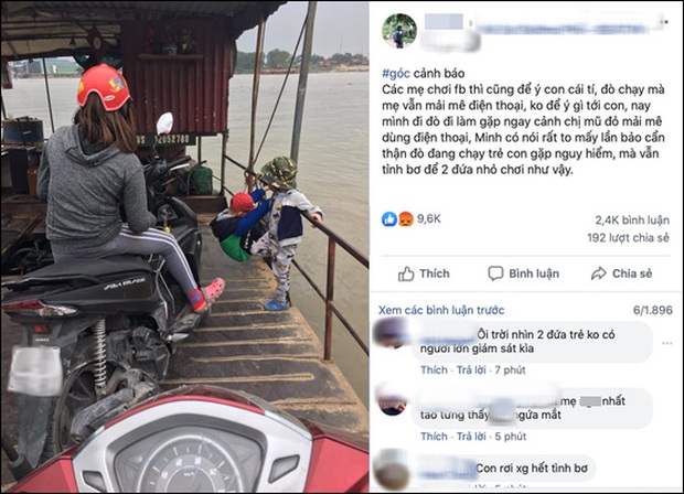 Người đàn bà ngồi trên xe máy ngay bên cạnh được cho là mẹ của 2 cháu bé. Theo người đăng tải hình ảnh, người đàn bà này không hề để ý đến 2 con mà chỉ tụ họp dùng điện thoại.